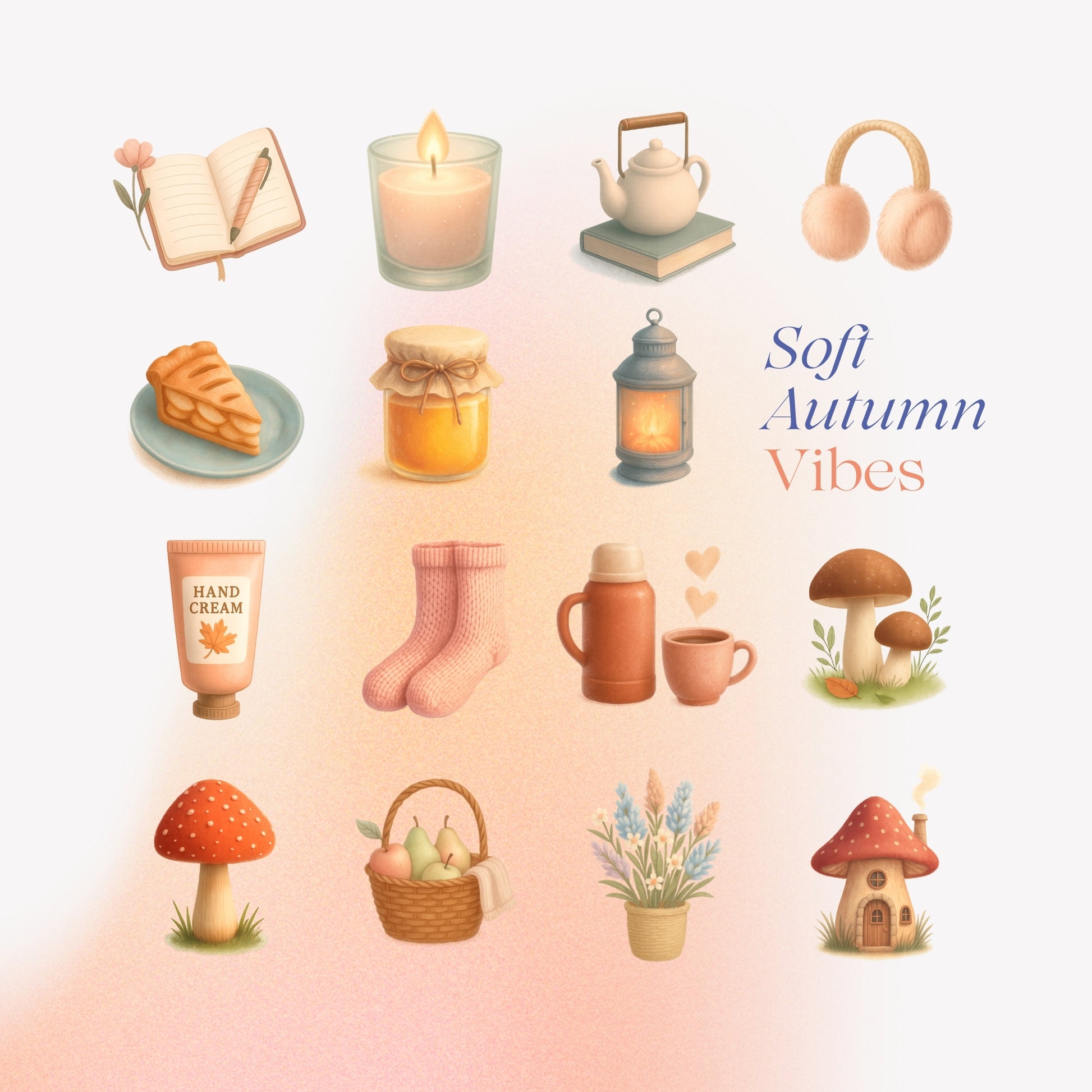This dreamy collection includes 15 dreamy illustrated stickers in soft pastel shades – from cozy mugs and autumn treats to whimsical mushrooms and knitted socks.