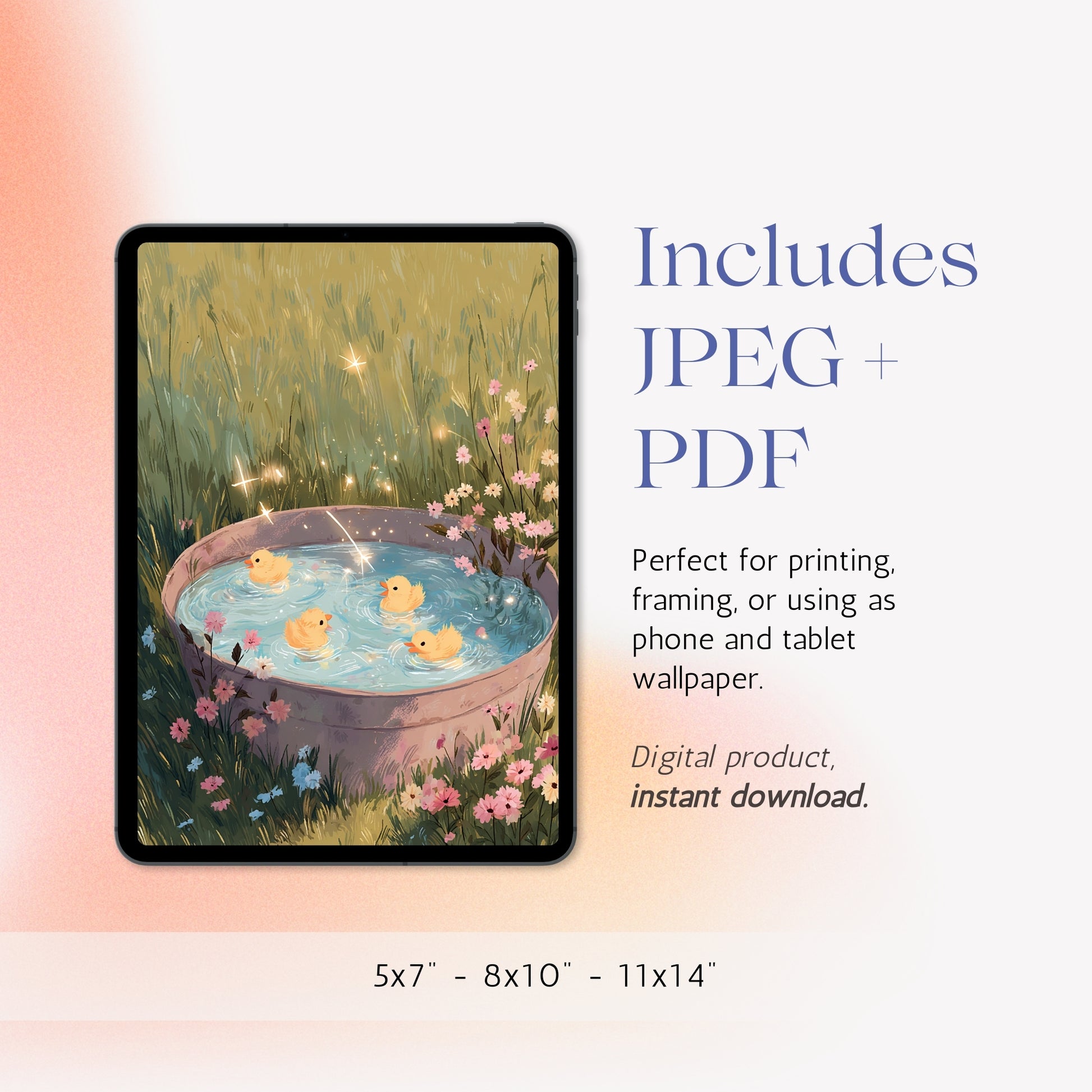 Playful ducklings floating in a flower-filled tub — this whimsical artwork adds lightness and joy to any space. Perfect for kids’ rooms, bathrooms, or anyone who loves a little charm on their walls.