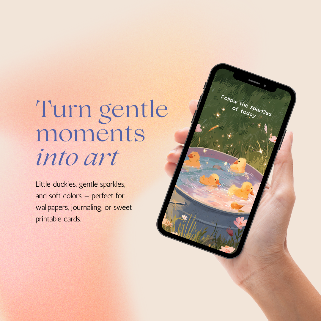 Bring a touch of gentle magic into your days with the Duckling Dreams Postcard Set. This printable pack includes 4 dreamy illustrations of cozy ducklings swimming under sparkles and flowers, perfect for gifting, journaling, or decorating your space.