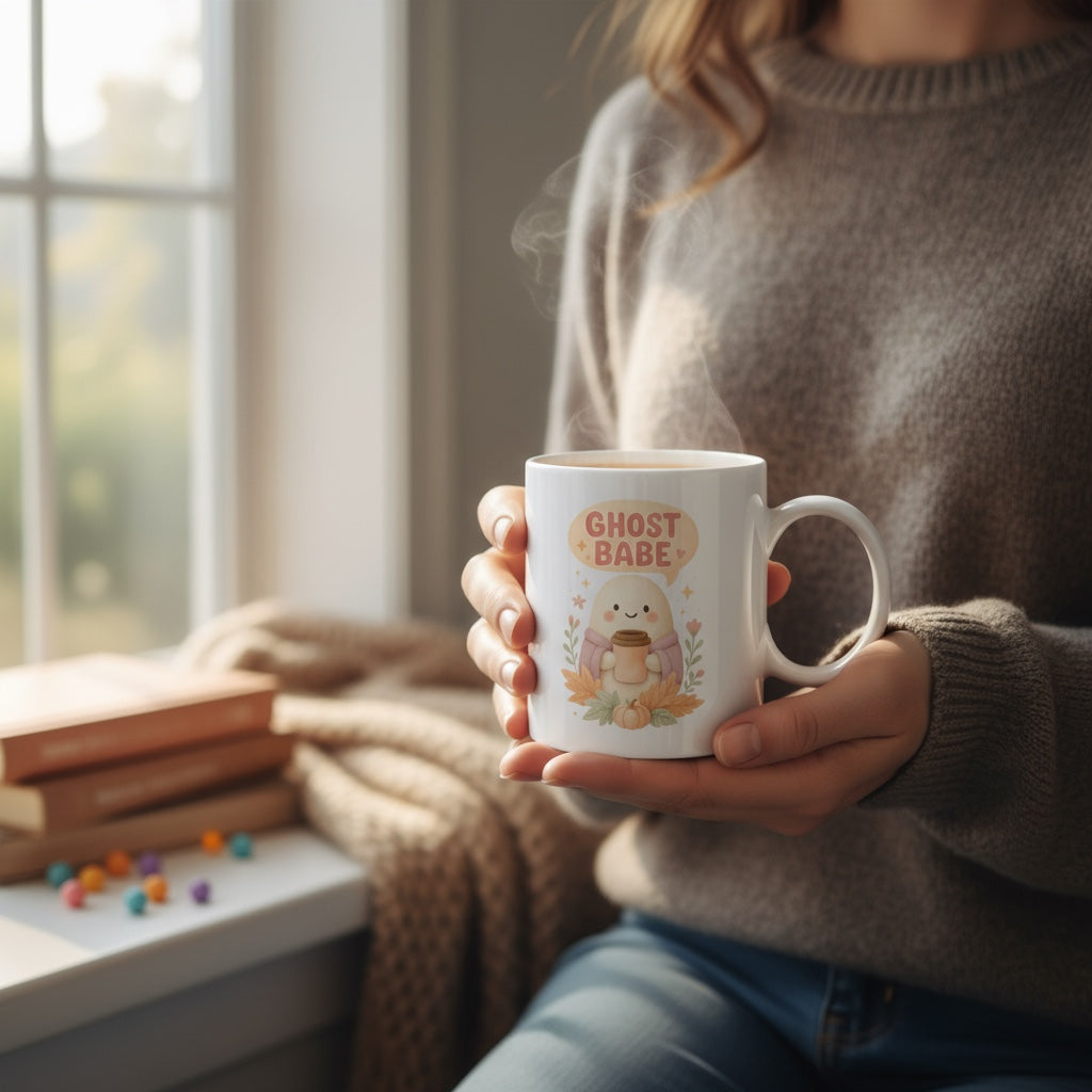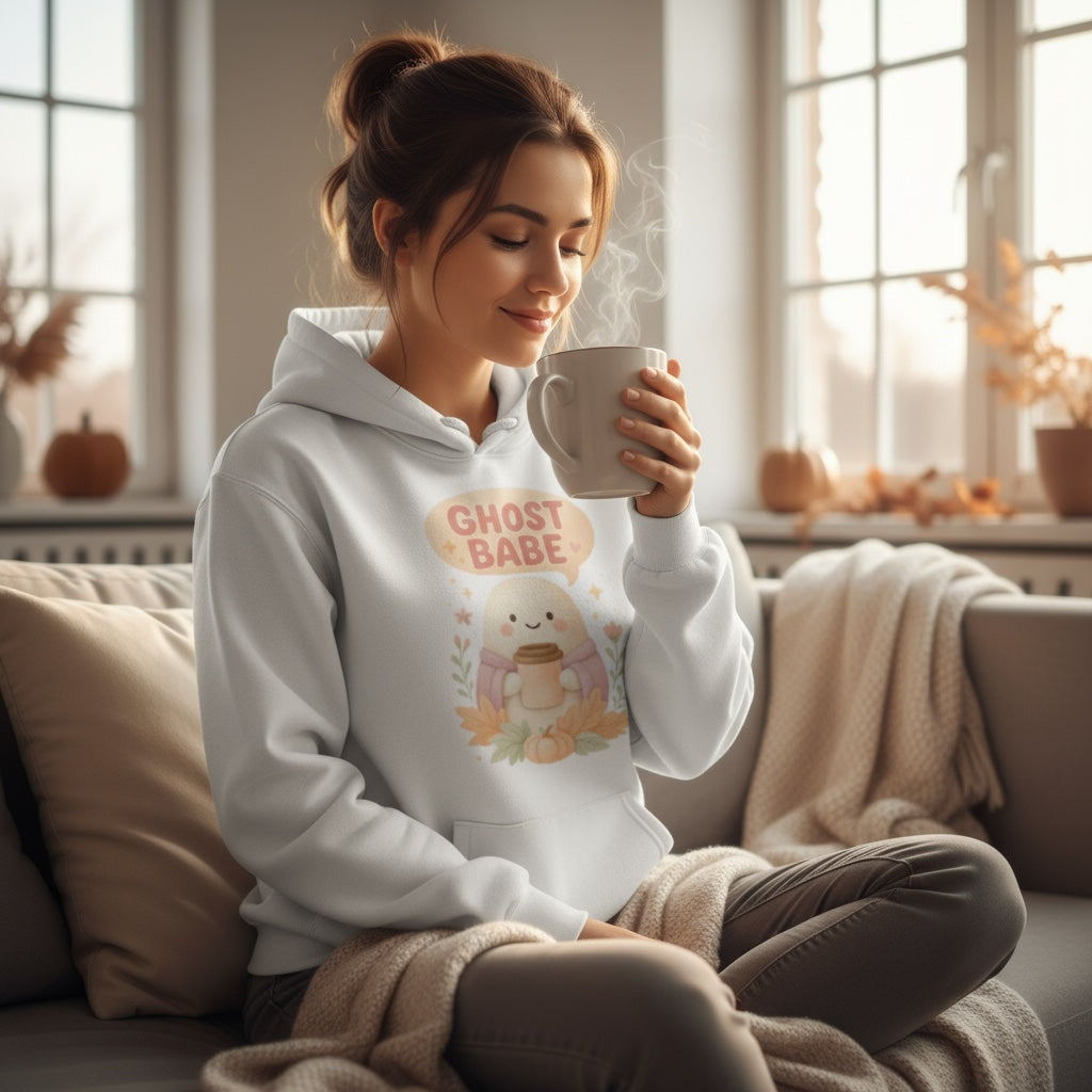 Cozy up this spooky season with the sweetest little ghost! The “Ghost Babe” illustration features a pastel ghost holding a coffee cup, wrapped in a soft autumn cardigan, surrounded by pumpkins, leaves, and florals. Perfect for t-shirts, mugs, tote bags, hoodies, or seasonal decor, this design blends kawaii charm with cozy fall vibes.