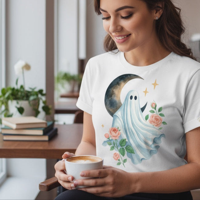 A dreamy ghost draped in white with soft watercolor roses and a glowing crescent moon. This illustration mixes spooky charm with delicate floral details, making it perfect for cozy Halloween vibes. Ideal for printing on t-shirts, tote bags, mugs, posters, or seasonal decor, it adds a touch of magic and softness to your creations.